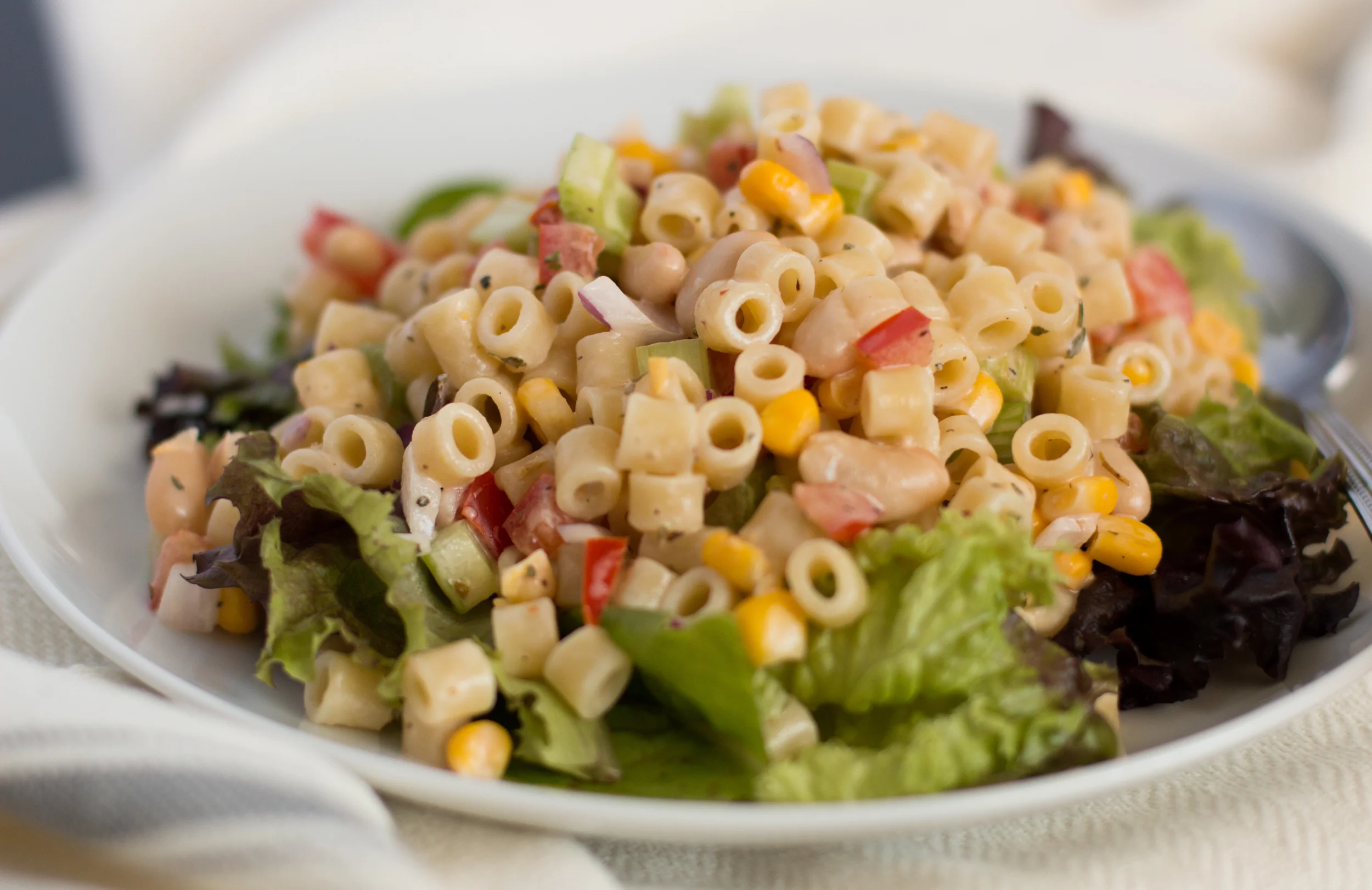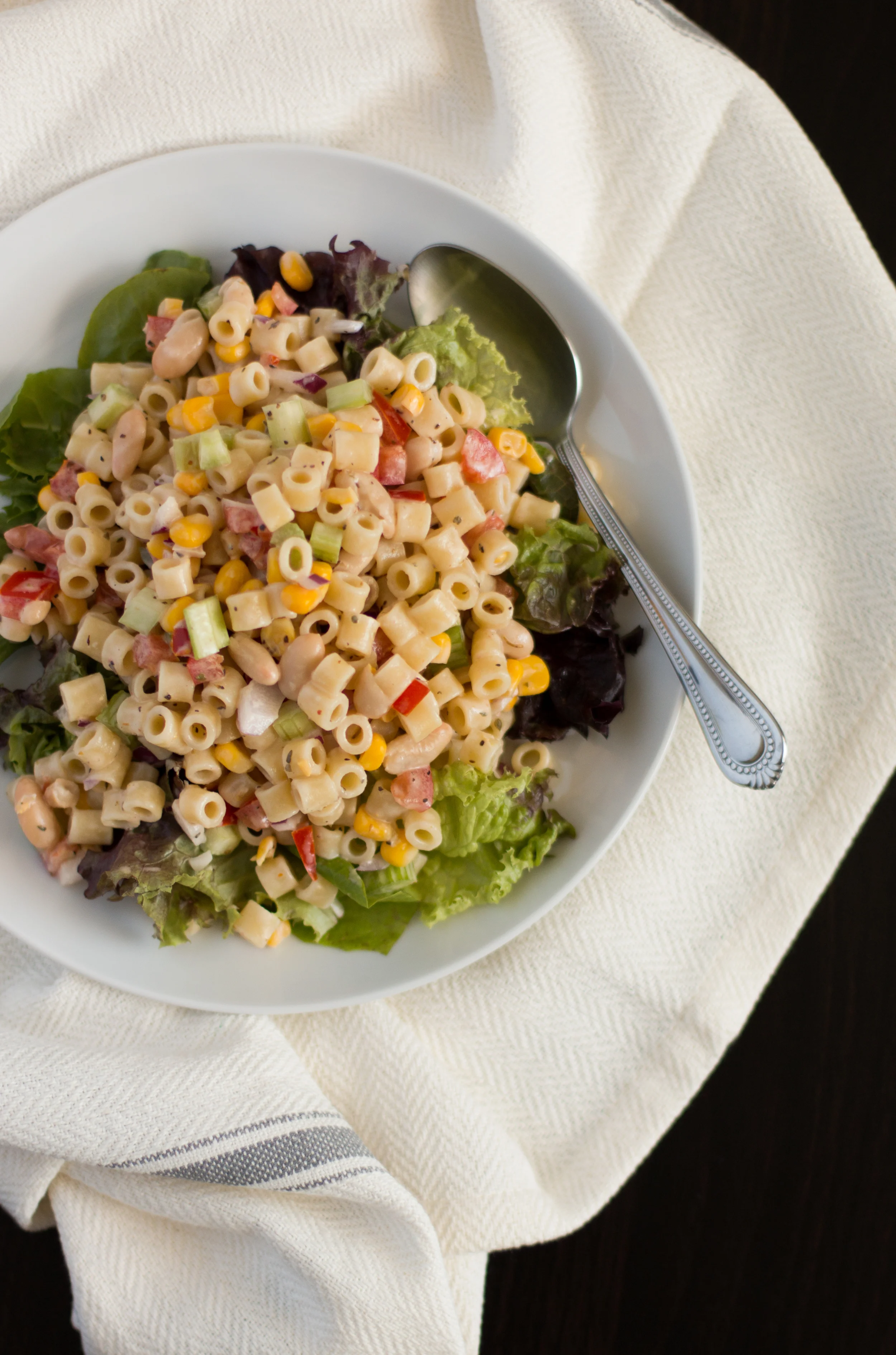 Esta ensalada de macaroni cremoso y delicioso es el plato ideal para el verano toda la familia podrá disfrutar. Mi ingrediente favorito en esta ensalada es el maíz. El maíz tiene muchos componentes nutricionales. Proporciona fibra, magnesio, hierro, vitamina B-6, y la proteína. Aproximadamente 1 taza de este increíble grano proporciona 12 gramos de fibra, 16 gramos de proteína, y casi el 50% de su valor diario de vitamina B-6. La vitamina B-6 participa en el desarrollo del cerebro, haciendo neurotransmisores (sustancias químicas que transportan señales entre las células) y haciendo la hormona serotonina (una sustancia química que equilibra nuestro estado de ánimo). A veces, el maíz tiene una mala reputación como un almidón vegetal, pero nos proporciona tanto un delicioso sabor dulce en una ensalada de macarrones y algunos beneficios para la salud.