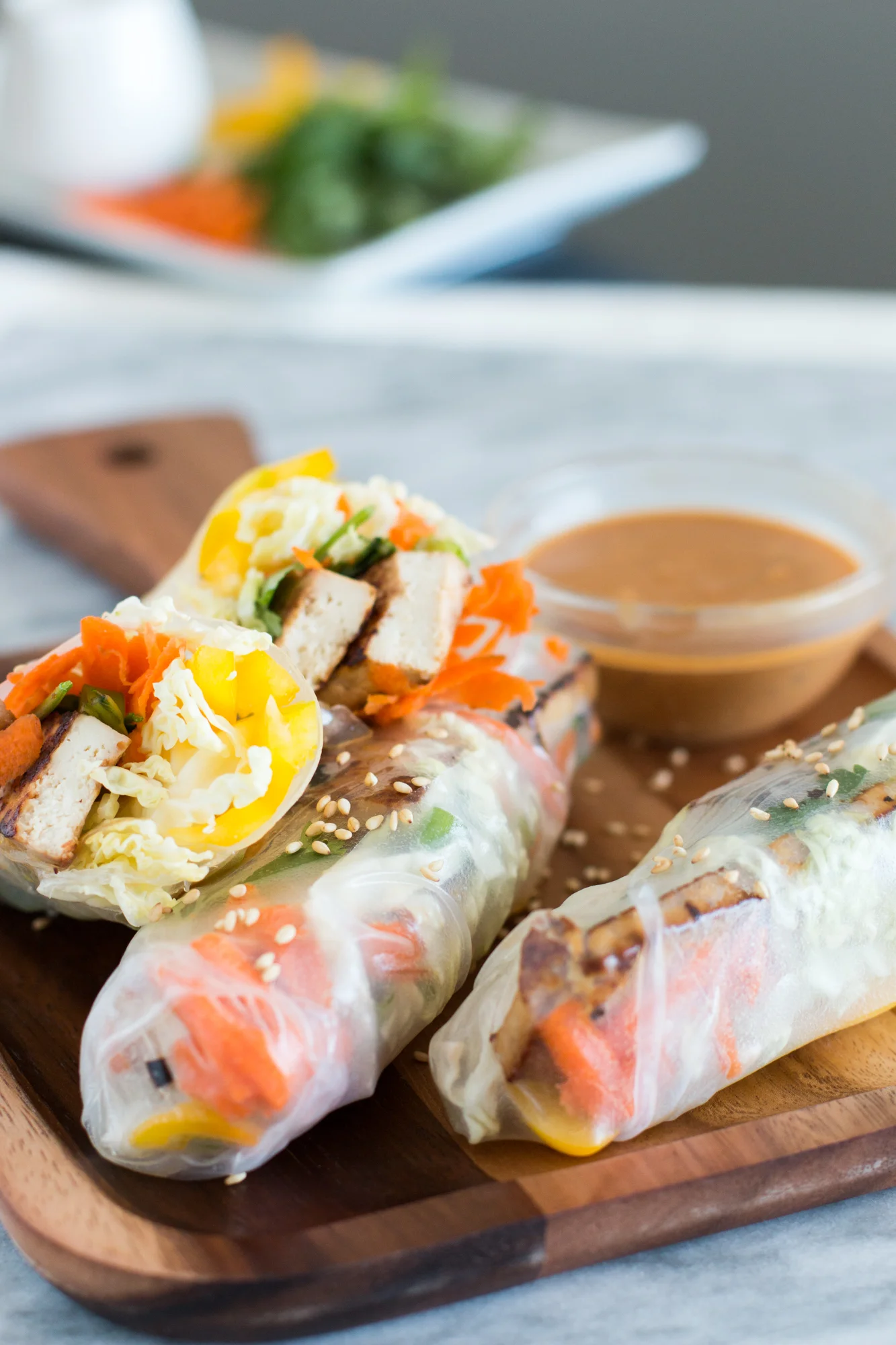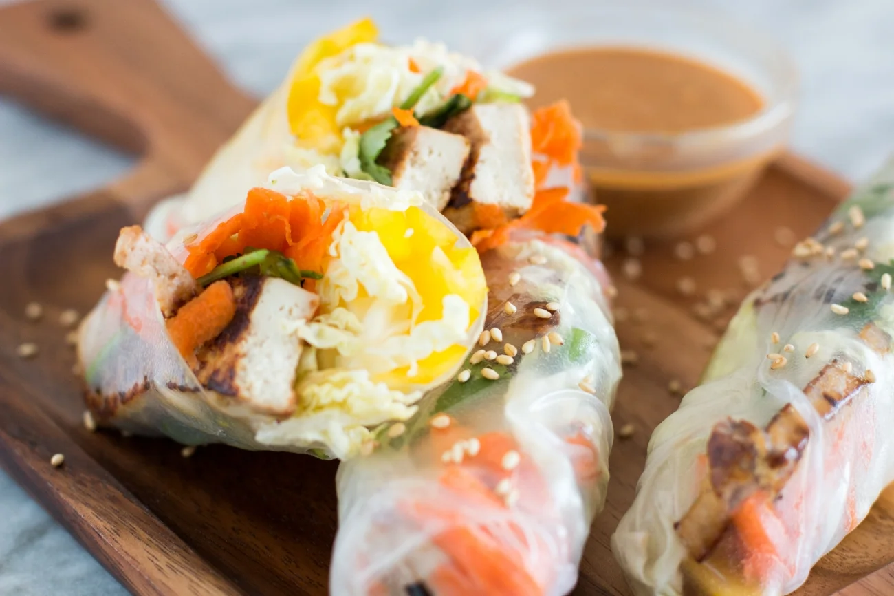 Rollitos de Primavera con Tofu y Salsa de Crema de Cacahuate con Jenjibre