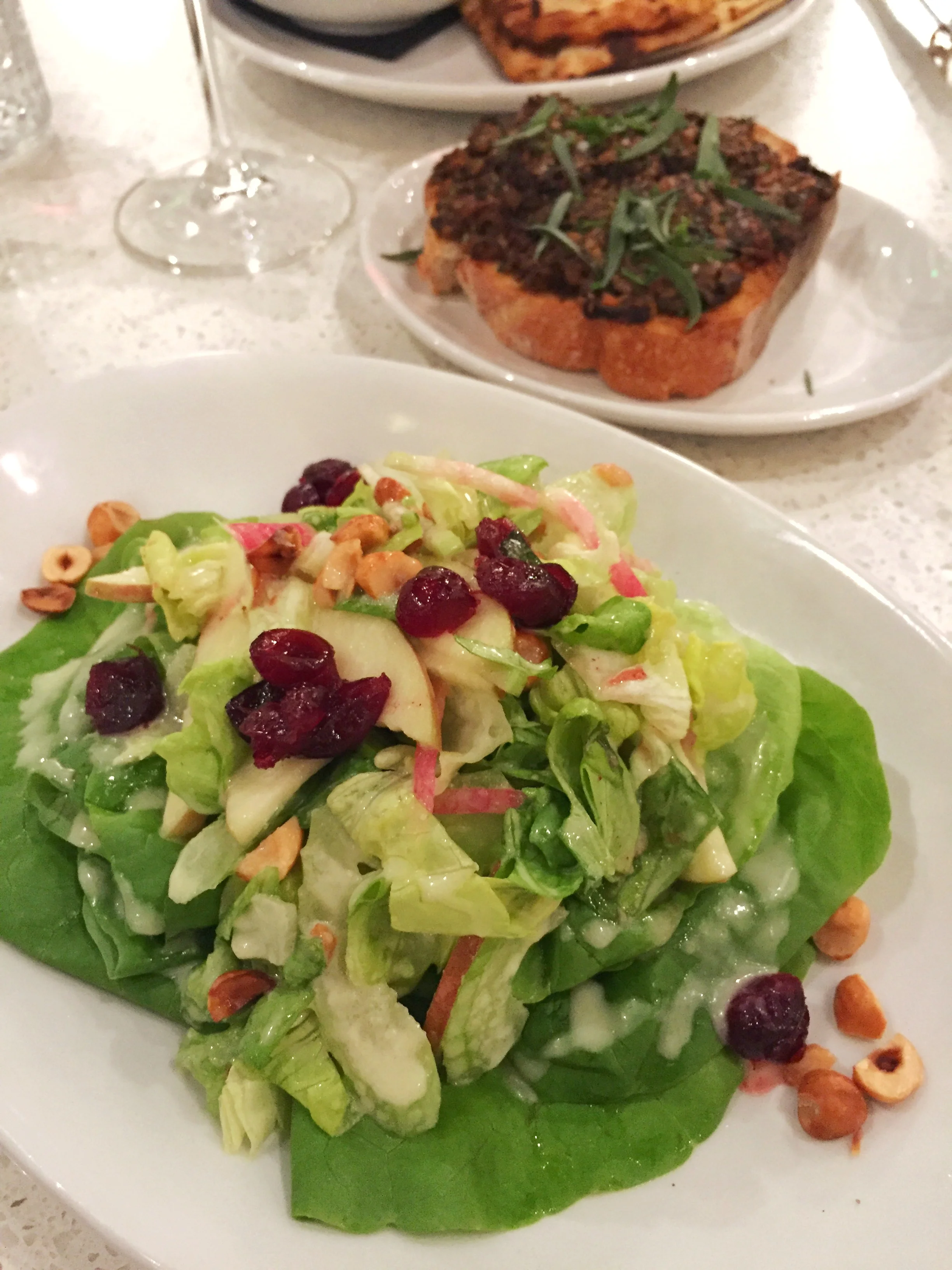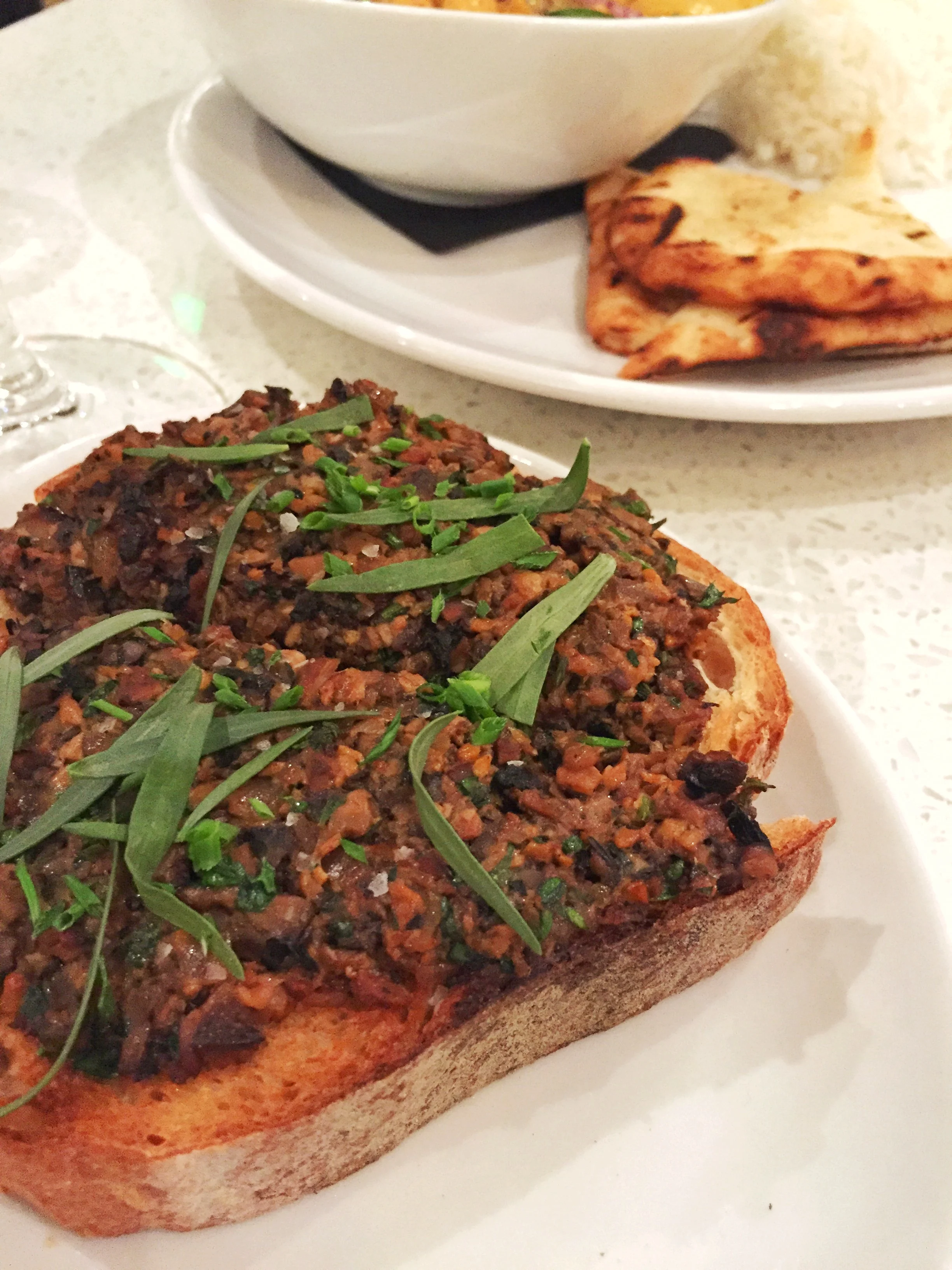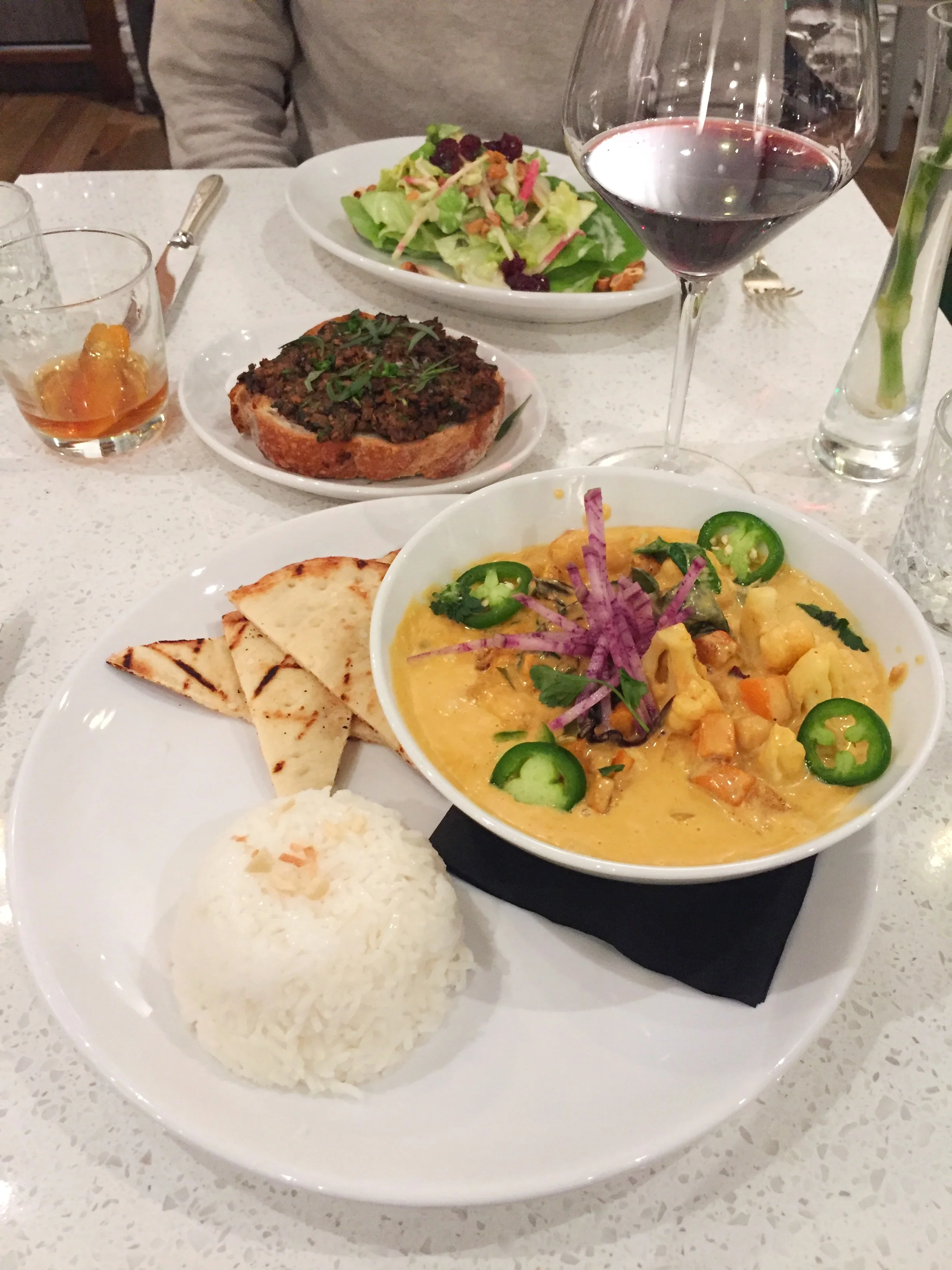 We then shared three other dishes: their seasonal curry with a side of jasmine rice, a butterleaf salad, and toast with a mushroom tapenade. A noteworthy dish was their pumpkin curry. This is a must try if on the menu! It was flavored with just the right touch of sweetness with the butternut squash and spiciness from the topped jalapenos. The butterleaf salad reminded us of summer salads – fresh and crispy greens recently picked from the farm. It had such a simplicity to it yet had a lot of flavor because of its freshness. Also, the dietitian in me was thankful that it had just the right amount of dressing drizzled over it.